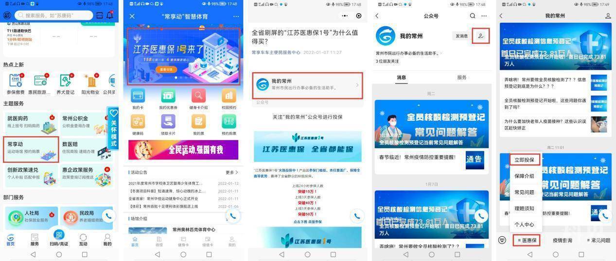 即日起,常州市民可登录“我的常州”APP或微信公众号在线投保。点击“我的常州”APP,下拉点击“常享动”模块,点击顶部“江苏医惠保1号来了”,跳转微信点击“我的常州”公众号,关注后并在底部菜单栏左下角点击“医惠保”投保;或直接关注“我的常州”微信公众号,在底部菜单栏左下角点击“医惠保”投保。