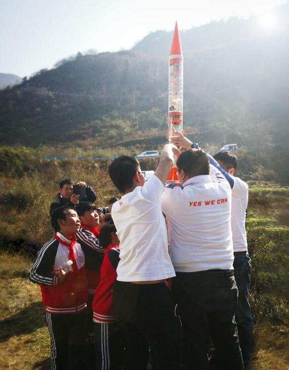 于是,在三个月时间里,曹林和同事自己设计图纸,自己3D打印零部件,经过一次次失败,克服重重困难,最终设计出一枚小型气象探空火箭。今年1月,他们亲赴贵州,和孩子们一起在校园里将火箭组装完成。1月5日,经过当地相关部门批准,带着孩子们梦想的自制气象探空火箭成功发射升空,现场百余名学生们欢呼不已。