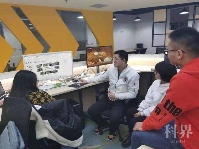 盛建中(左二)与团队交流图片处理事宜。(受访者供图)