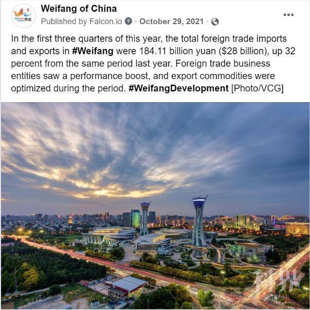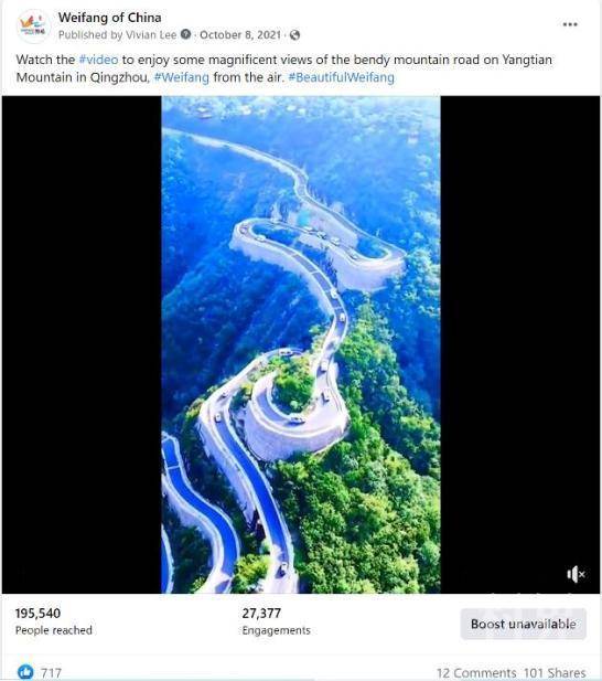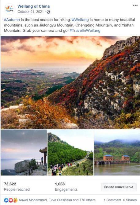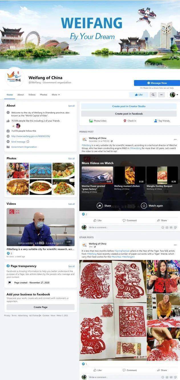 潍坊英文脸书专页“Weifang of China”自2020年12月1日正式上线以来,紧扣“风筝之都,品质潍坊”的城市形象定位,每天及时对外发布潍坊新闻动态,成为向海外讲好潍坊故事、传播潍坊声音的重要窗口,极大地提升了潍坊这座城市的国际影响力。