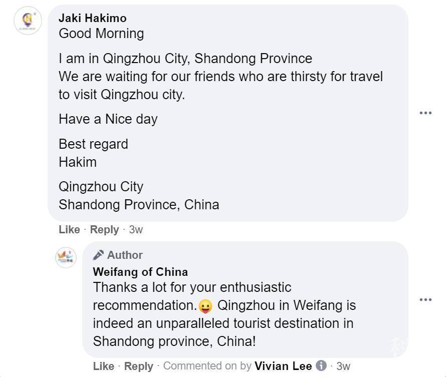 ▲在帖文“外国友人讲山东故事丨潍柴外籍专家欧佩迪:在山东搞研发,成就感和获得感很强”下,网友Jaki Hakimo留言道:“早上好,我正在山东省青州市,我们正期待着那些热爱旅游的朋友来青州,预祝你们玩得愉快!”,页面及时回复:“谢谢你热情的推介,位于中国山东省潍坊市的青州确实是一个无与伦比的旅游目的地”。