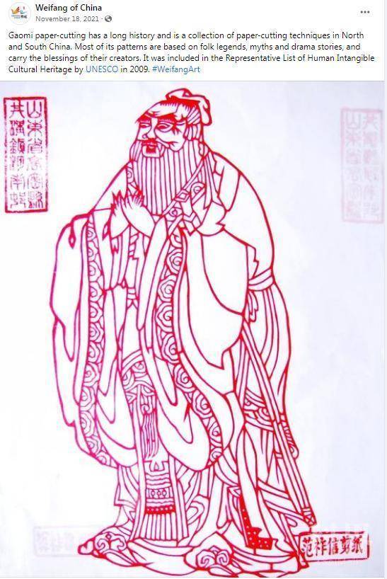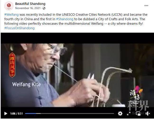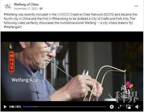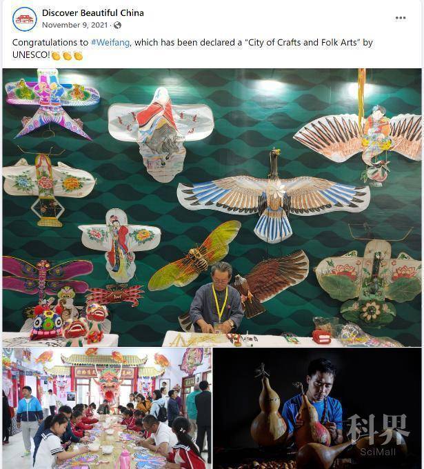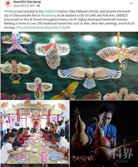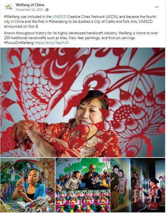 北京时间11月8日,联合国教科文组织正式公布:山东省潍坊市成功入选联合国教科文组织创意城市网络,成为我国第四个、山东省第一个世界“手工艺与民间艺术之都”。潍坊脸书账号第一时间发布了这一好消息,同时后期还结合本市的一些著名文化和非遗项目,为潍坊打造的这张世界级“金名片”宣传造势。