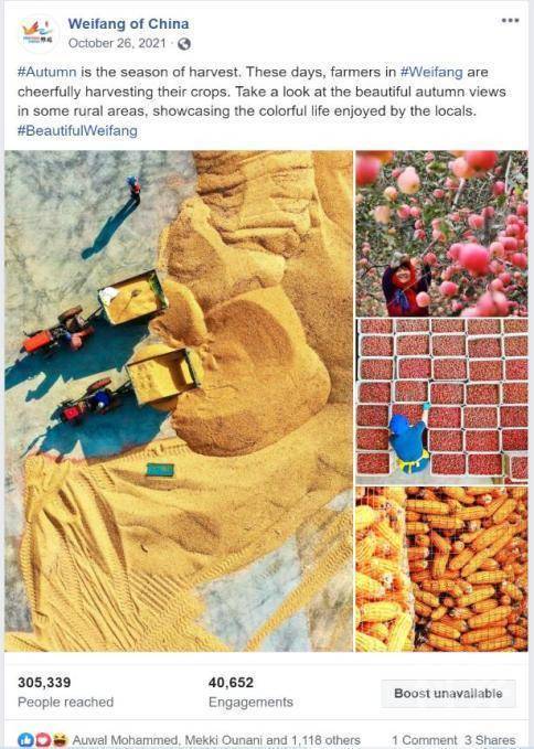 ▲2021年11月4日,潍坊脸书账号发布“潍坊金秋大片,真是长在我的审美上了”被发现美丽中国脸书转发。
