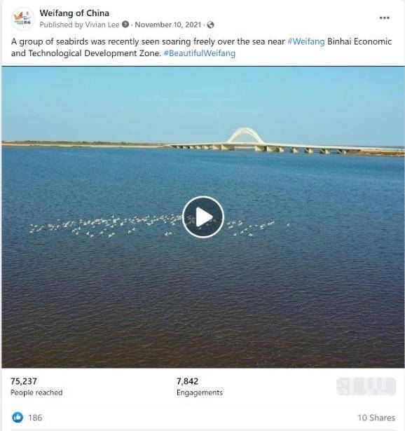 截至2021年11月30日,潍坊脸书专页粉丝量总计超7万人,累计发布帖文520篇、视频27个,累计阅读量达981万,获得海外受众的点赞、评论、转发等互动量达57万人次。