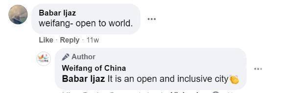 ▲在帖文“前三季度潍坊外贸发展交出满意答卷”下,网友Babar Ijaz留言道:“潍坊正向世界敞开大门”,页面及时回复:“这是一座开放而包容的城市”。