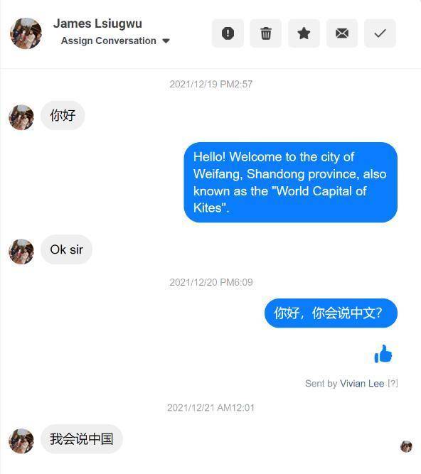 ▲热爱中国文化的网友James Lsiugwu用中文给页面发私信:“你好”、“我会说中国(文)”,页面热情回应并邀请他来潍坊游玩。