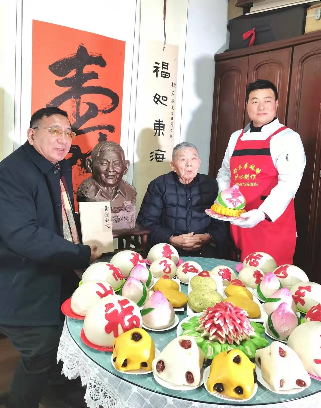 市民俗学会、徐州全媒体联盟和徐州老房子团队一行四人看望了钱老,赠送了鲜花、福字年历和一套彭祖寿桃馍,祝愿钱老健康长寿,虎年安吉。钱树岩老人向来者回赠了个人文集和书法集,还向知书轩艺术馆赠送了墨宝。