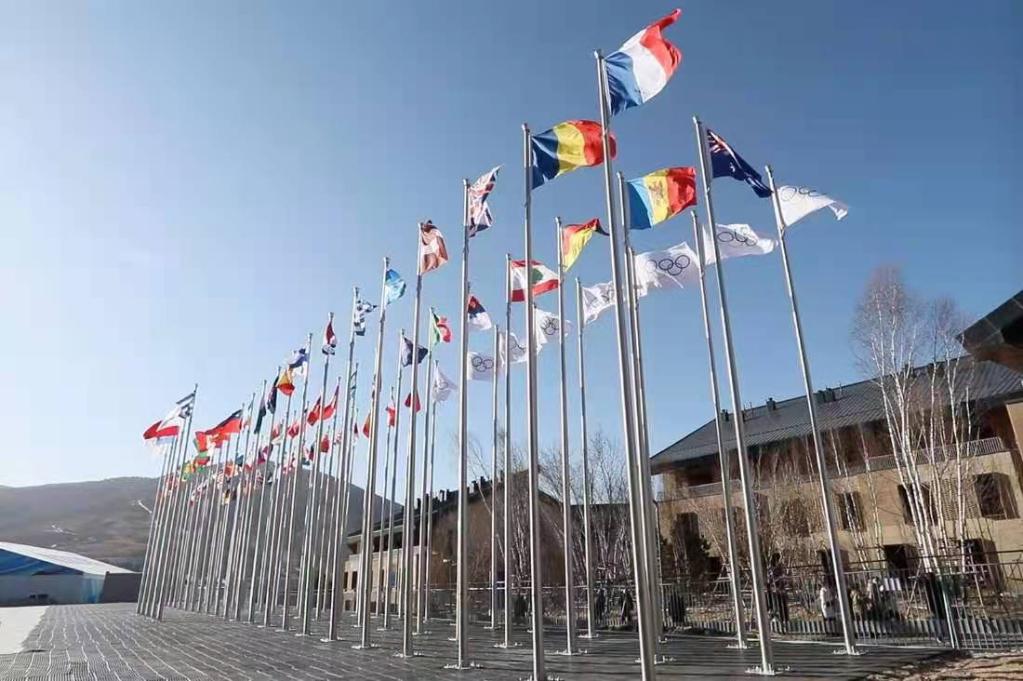 2021年12月22日,张家口冬奥村口飘起各参赛代表团旗帜。新华社记者 杨帆 摄