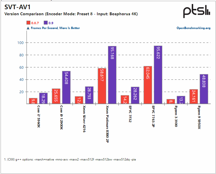 具体来看,SVT-AV1 0.9 编解码器减少了内存占用,为 4K 以上的高分辨率提供试验支持,此外还使用 SSE 指令集加速编码。