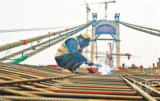 1月24日,郭家沱长江大桥施工现场,工人正在加紧作业。临近春节,郭家沱长江大桥的建设者们坚守岗位,加紧施工,确保工程进度。目前大桥已吊装39片钢桁梁,完成总进度的67%。