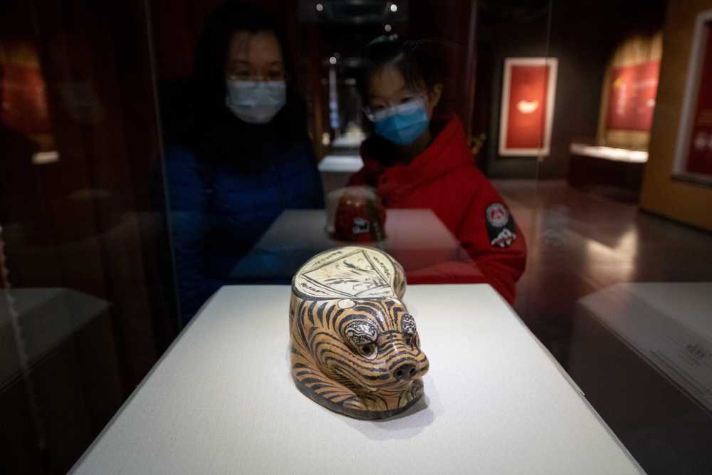2022年1月25日,山西省太原市,市民参观含有虎元素的出土文物。当日,50余件出土于山西的虎文物在山西考古博物馆展出,从3700多年前新石器时代的玉虎头到1000多年前宋金时期的虎形瓷枕,展现出中华民族源远流长、延绵不绝的虎文化。 中新社记者 韦亮 摄