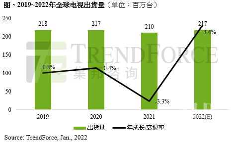 1 月 26 日消息,TrendForce 集邦咨询于 1 月 25 日发布了 2022 年电视市场预测。该机构表示,2021 年电视品牌上半年出货表现受惠于美国救济金所带动,使得北美出货持续畅旺。与此同时,品牌持续进行面板库存回补,推升面板价格不断攀高。下半年由于疫情趋缓,需求面临考验,此外原料和运费增长推高了成本,导致电视涨价。2021 年全球电视出货量衰退 3.2%,达 2.1 亿台。