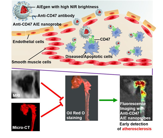 南开大学生命科学学院生物活性材料教育部重点实验室孔德领教授团队和丁丹教授团队联合开发出一种高亮度聚集诱导发光(AIE)纳米探针,可特异性结合在动脉粥样硬化斑块中过表达的CD47分子,从而精准、灵敏识别动脉粥样斑块,该新型纳米探针还可用于抗动脉粥样硬化药物的快速筛选,助力心血管疾病筛查和药物开发。日前,介绍该成果的论文发表于国际知名材料学期刊《先进材料》(Advanced Materials)上。