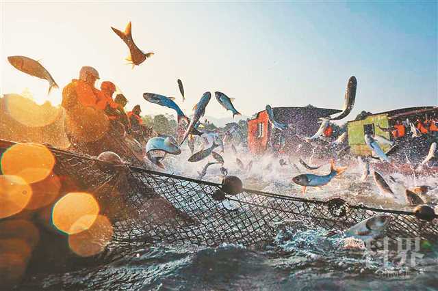 2021年10月24日,长寿区长寿湖,大洪湖水产公司的工人正在捕鱼。通讯员 樊强 摄/视觉重庆