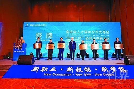 图为2021年11月20日-21日重庆英才大会中,市领导为“巴蜀工匠”协同培养融合区等高技能人才创新培养试点区授牌。