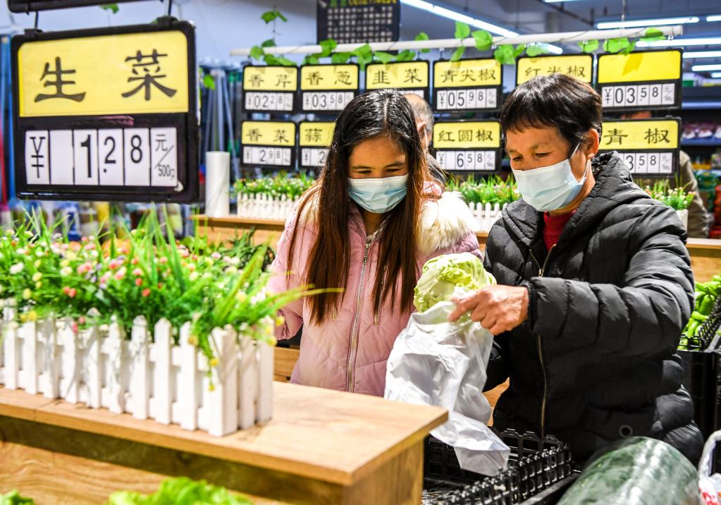 1月18日,居民在广西兴业县“老乡家园”配套建设的平价超市内购买蔬菜。新华社记者 曹祎铭 摄