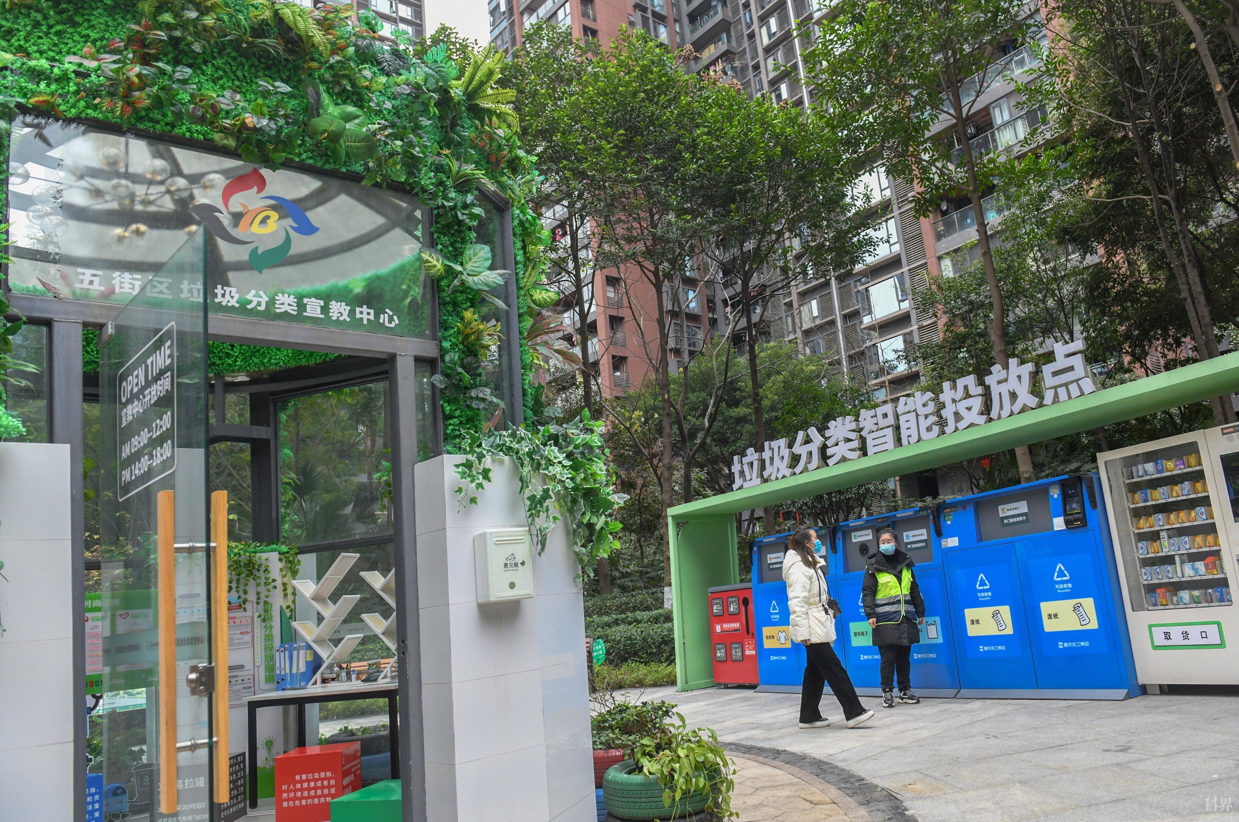 2022年1月26日,渝北区月隐湖社区鲁能星城五街区,工作人员在中庭设置的垃圾分类宣教中心、垃圾分类智能投放点为居民服务。该小区居民分类知晓率达到100%,参与率95%,办卡率90%以上,小区内安装的智能可回收设备、地下车库分类投放点和多网融合服务点运行良好、管理有序。记者张锦辉摄/视觉重庆