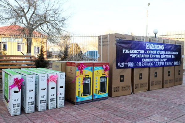 凛冽寒冬,乌兹别克斯坦的室外气温已低至零下15度,呵气成冰、满地白霜。乌兹徐工合资公司此时却是爱心浓浓、热火朝天!空调、电视机、电脑、打印机、吸尘器……一个个码放整齐的电器“大件”被小心翼翼地装上车,直至四辆货卡装得满满当当。