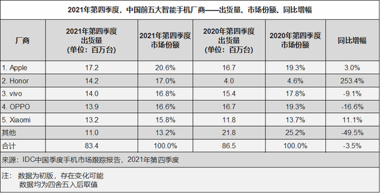 新浪科技讯 北京时间1月30日午间消息,根据最新国际数据公司(IDC)手机季度跟踪报告,2021年第四季度,中国智能手机市场出货量约8,340万台,同比下降3.5%。2021年全年中国智能手机市场出货量约3.29亿台,同比微涨1.1%。