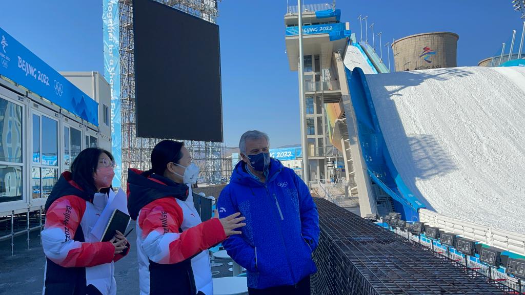 小萨马兰奇首先到达大跳台奥林匹克大家庭休息室、二层看台区和观景台。赛时,这里将接待来自世界各地的宾客。有关此区域的防疫用品及餐点提供、观赛角度位置和看台坐席设置,以及场馆赛道塑形、观众坐席、OBS(奥林匹克转播服务公司)及摄影机位布设等细节,小萨马兰奇进行了详细询问,并对首钢滑雪大跳台的充分准备表示满意。