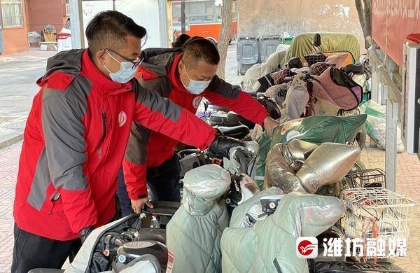 奎文门社区工作人员正在整理楼前电动自行车。