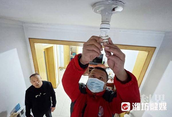 2月3日,在奎文区东关街道奎文门社区,社区工作人员正在给居民家维修顶灯。春节期间,该社区开展“春节我在岗、服务不打烊”活动,社区工作人员坚守岗位,活跃在社区的各个角落,排查安全隐患、提供便民服务等,让虎年的春节变得更加温馨。