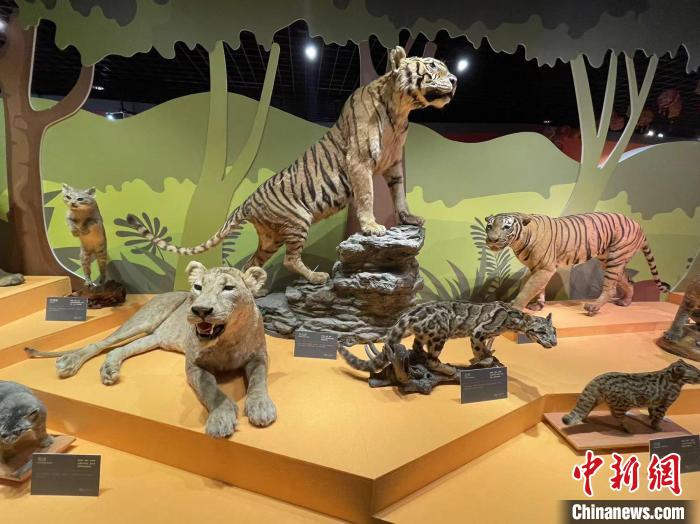 浙江自然博物院生命科学部工作人员陆祎玮表示,本次共展出16件猫科类动物标本,皆为浙江自然博物院馆藏。此外,现场还展出了3件剑齿虎、巨颏虎等古生物化石。“我们希望从虎的起源、形态特征、种类和习性等方面进行介绍,让人们更了解虎。”
