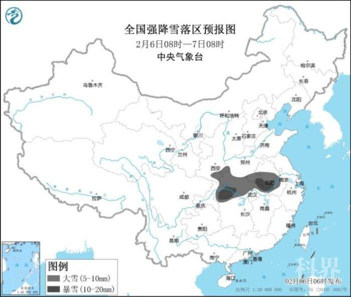 全国强降雪落区预报图(2月6日8时-7日8时)