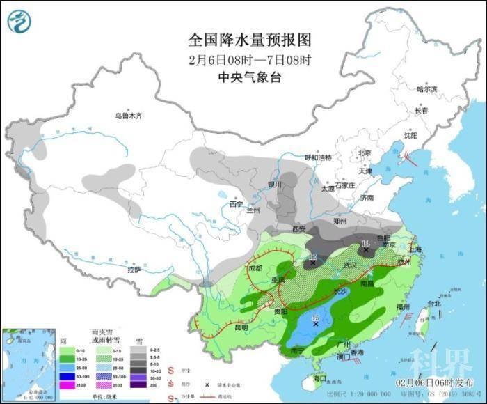 2月6日8时至7日8时,甘肃东部、宁夏东部和南部、陕西西部和南部、河南南部、贵州北部、湖北、湖南北部、安徽大部、江西北部、江苏中南部、浙江西北部等地部分地区有中到大雪或雨夹雪,其中,湖北西南部、安徽大别山区等地部分地区有暴雪(10~13毫米)。贵州南部、湖南中南部、江西中南部、广西大部、广东北部等地部分地区有中雨,其中,广西中部和东北部的部分地区有大雨(25~45毫米)。