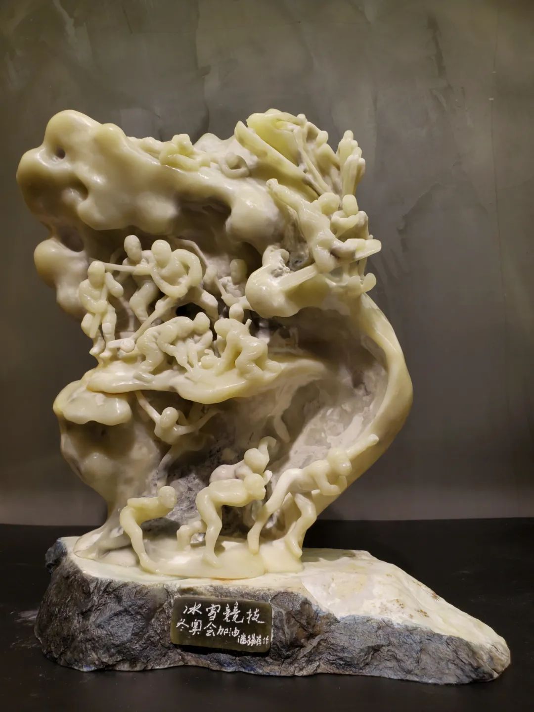 《冰雪竞技》是省级非遗代表性传承人、省工艺美术大师潘锡存为北京冬奥会量身定制的一件石雕新作。“这件作品一个多月前赶在冬奥会前完成,采用镂雕、圆雕、高浮雕等形式。”据潘锡存介绍,这件作品是其运动系列作品之一,采用寿山芙蓉石创作,整件作品看上去晶莹剔透,与冰雪运动主题相得益彰。约35*32厘米高的一块石头精心布局,将冬奥会的速度滑冰、冰壶、雪车、自由式滑雪等项目竞技状态巧妙融为一石,浑然天成,赏心悦目。“我是一个守艺人,想用作品留下特别的记忆。” 为了让创作的人物运动形象更逼真,潘锡存花了很大一番功夫,上网查了很多冬奥会项目资料,进行了很长时间的构思后才动手创作,一气呵成。