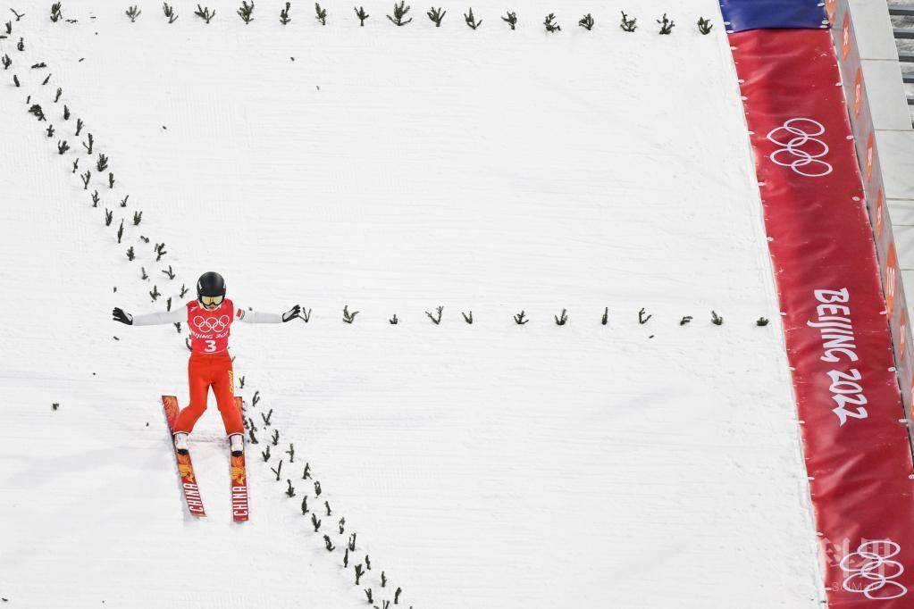 2月3日,中国选手彭清玥在北京冬奥会跳台滑雪女子标准台官方训练中。新华社记者朱峥摄