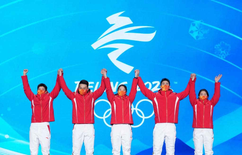 5日晚获得短道速滑混合团体接力冠军的中国队成员,武大靖、任子威、范可新、曲春雨、张雨婷登台领奖。国际奥委会副主席于再清为获奖队伍颁奖,随后现场升中华人民共和国国旗、奏中华人民共和国国歌。
