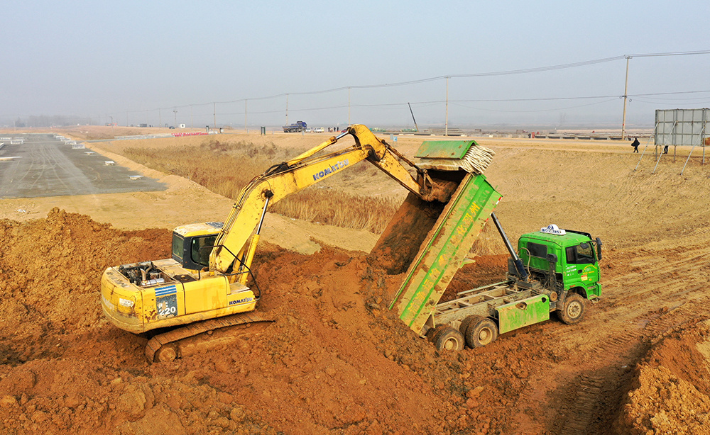 近日,记者来到邳州新港建设现场,多辆施工机械车辆正在进行土方回填。