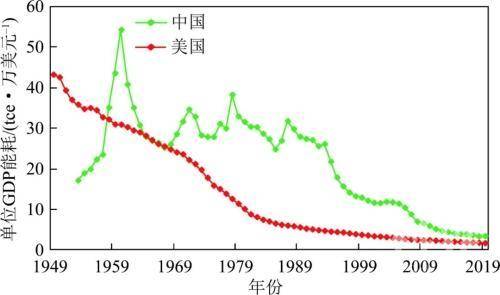 二、碳中和目标下我国能源发展路径 依据现代化进程的经济和社会指标综合判断,目前我国现代化程度与美国1950—1970年相当,这一差距要求现代化进程持续推进,仍然需要能源支撑。 能源领域是我国实现碳达峰碳中和的核心所在,但不意味着要完全退出煤炭,完全退出化石能源。借鉴美国碳达峰前后的能源消费、碳排放强度等基本特征和变化规律,结合我国能源资源禀赋和经济社会所处发展阶段,碳达峰碳中和目标下,我国能源发展将主要有三大路径。1. 持续提高能源效率,减少能源消费 美国能源消费碳排放强度在碳达峰前期、达峰期下降幅度较小,实现碳达峰核心是提高能源效率,降低单位GDP能耗,在不大幅度增加能源消费的前提下,支撑经济增长。2019年美国单位GDP能耗仅相当于1949年的3.9%。 我国单位GDP能耗自1988年以来呈现快速下降趋势,由29.8tce/万美元降低到2019年的3.4tce/万美元,降低了88.6%,但距离世界平均水平和发达国家还有较大差距,是世界平均水平的1.4~1.5倍,是美国的2倍。若能达到世界平均,每年可少用能13亿tce、减排二氧化碳34亿t,约占2020年我国碳排放量的1/3。因此,提高能源效率,减少能源消费,是我国实现碳达峰碳中和的最重要途径。