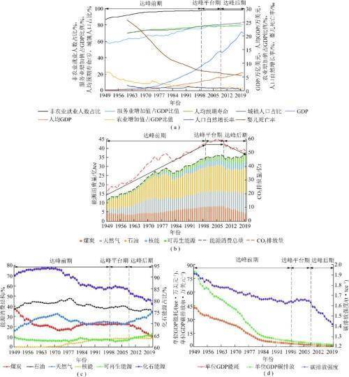 一、碳达峰前后美国现代化进程与能源消费特征 欧美主要发达国家在19世纪末、20世纪初完成了工业化,并开启现代化进程。发达国家在基本实现现代化后,能源消费与经济发展脱钩,能源消费达峰,碳排放开始下降。综合考虑经济体量、产业结构、人口规模等因素,美国的发展经验对我国有很好的借鉴意义。