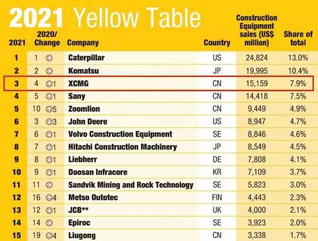 2021年5月11日,英国KHL集团发布全球工程机械制造商50强排行榜,徐工强势进位全球行业第三,开启“五年前二”珠峰登顶新征程。11月12日,英国KHL集团发布ICM20“世界最大起重机制造商”排行榜,徐工强势摘取世界起重机制造商榜首桂冠。