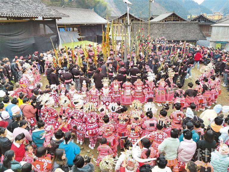 ▲ 2月5日,黔东南州榕江县朗洞镇卡寨村苗族同胞邀请周边村寨的群众到村寨一起吹芦笙、踩芦笙堂欢度佳节。