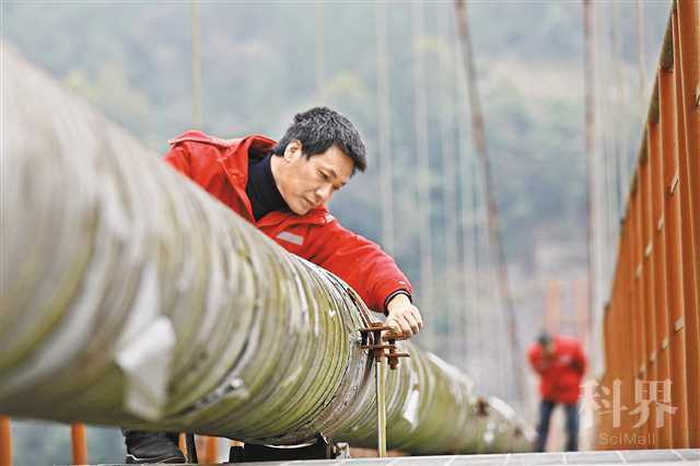 二月一日,在彭水苗族土家族自治县诸佛乡沙河悬索桥,武陵山天然气管道监护员检查管道安全情况。特约摄影 赵勇\视觉重庆
