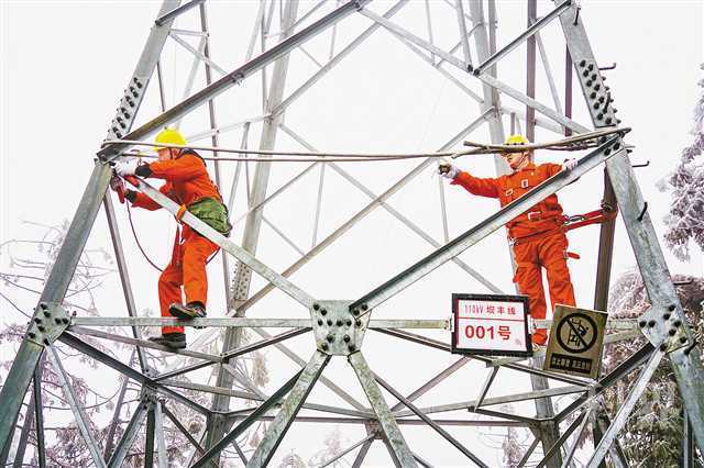 2月2日,国网重庆丰都供电公司输电运维班的电力巡线工人正在监测输电线路覆冰情况。连日来,重庆气温持续走低,在平均海拔达1800米的丰都县南天湖镇,部分高海拔区域出现雨夹雪,局地暴雪。通讯员 罗一灵 摄/视觉重庆