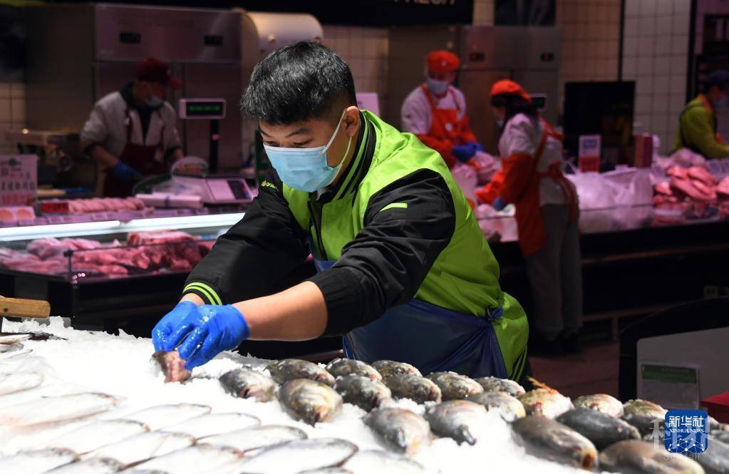 在北京市海淀区一家超市,工作人员码放水产品(2021年12月31日摄)。新华社记者 任超 摄