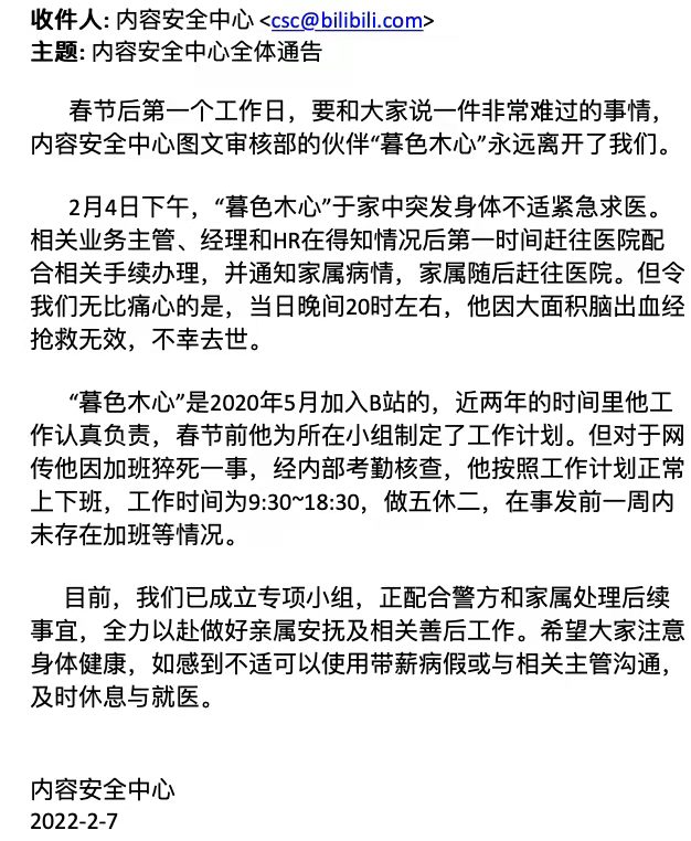 随后B站发布内部信回应此事。内部信提到,内容安全中心图文审核部的伙伴“暮色木心”于2月4日下午在家中突发身体不适紧急求医。当日晚间20时左右,他因大面积脑出血经抢救无效,不幸去世。