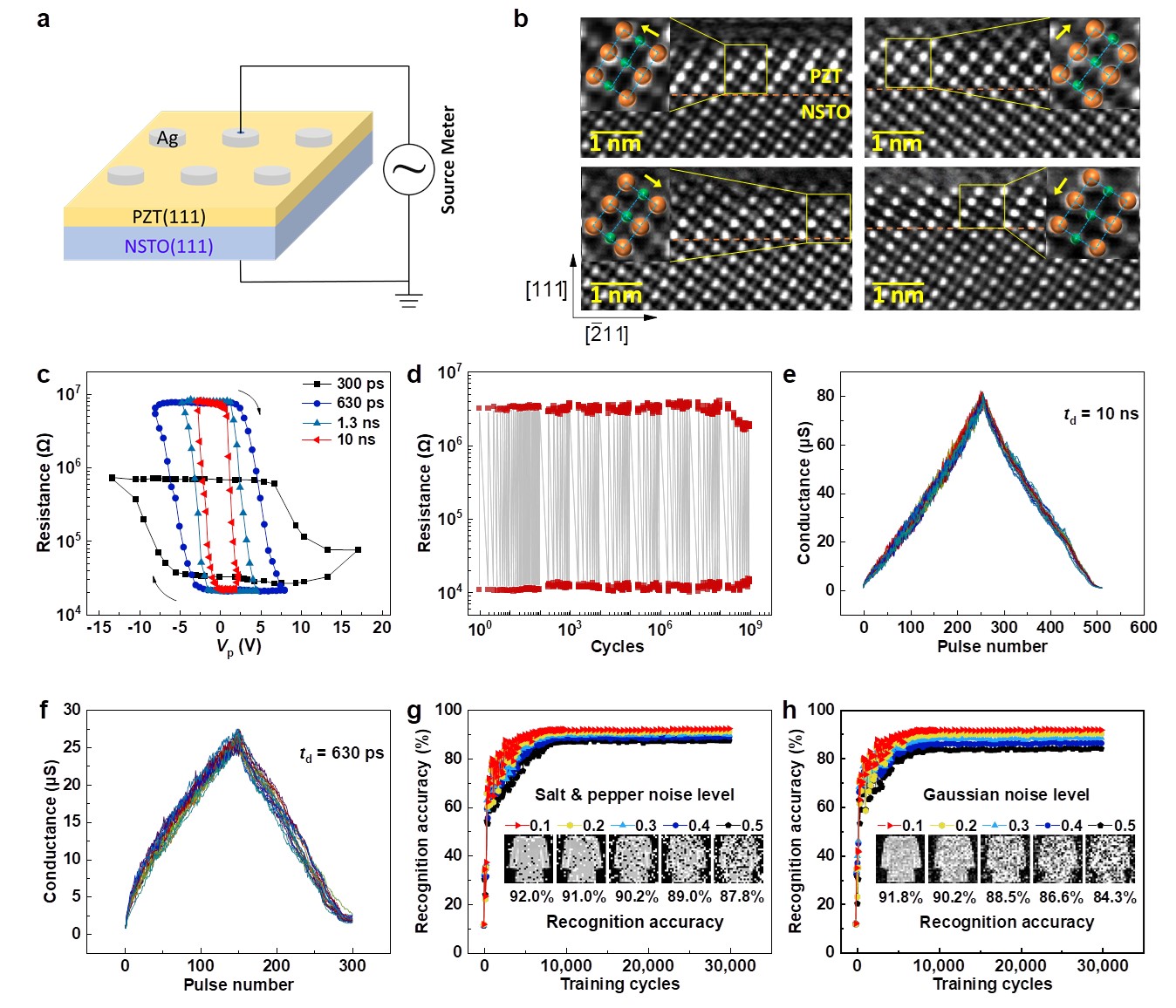 李晓光教授团队制备了高质量的铁电隧道结,通过PZT超薄厚度和取向的设计,获得了更小的铁电畴和更连续的翻转动力学行为,更丰富的铁电多畴亚稳态利于类脑突触器件中多态的可控调节。该器件表现出优异的综合性能:其8比特线性电导调控和高耐久性,满足类脑突触器件的核心性能指标要求。基于该器件性能仿真构建的神经网络具有高图像识别率,即使在图片中引入椒盐或高斯噪声,其识别图片的准确率仍然大于85%。此外,该器件具有亚纳秒超快操作速度,而且其能耗低至飞焦级。研究人员经过推算表明,该铁电隧道结构建的神经网络计算系统,有可能实现相当于人脑的优秀能效,而人脑神经元突触单次脉冲能耗约10飞焦。人脑突触响应速度约亚毫秒,其响应速度也比人脑突触快6个量级,堪称媲美人脑突触的能效表现。