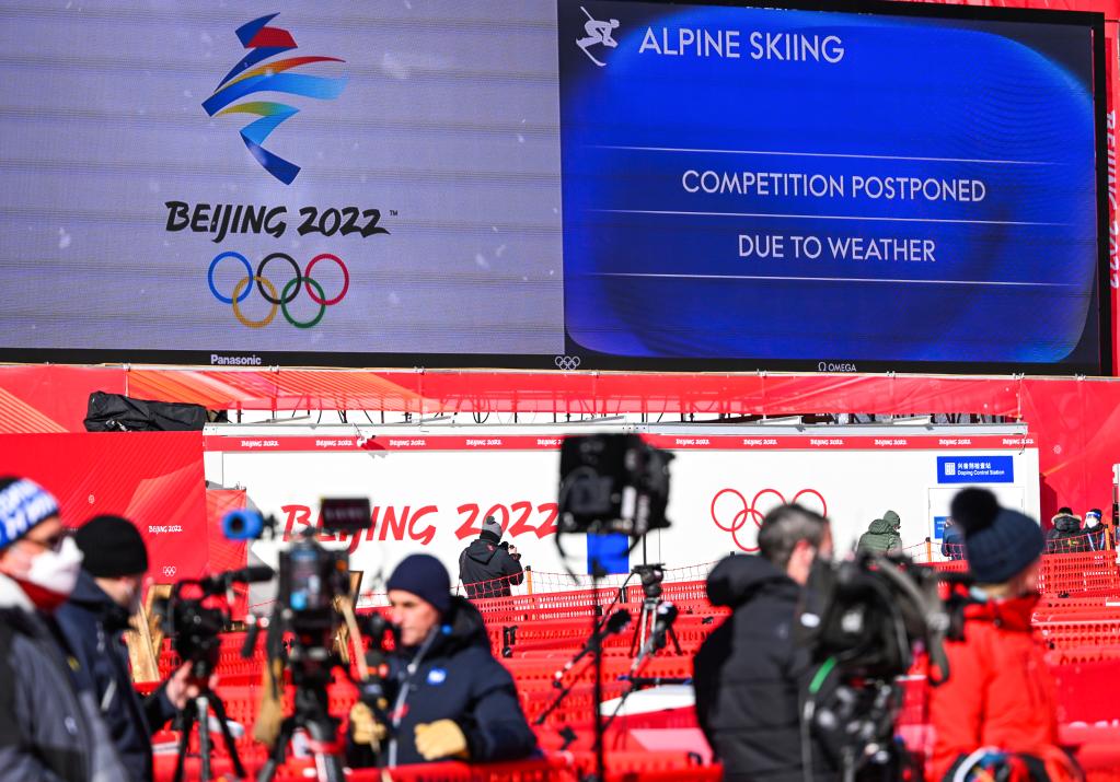 2月6日,在高山滑雪速度赛道终点,大屏幕显示男子滑降项目比赛延期举行。新华社记者连振摄