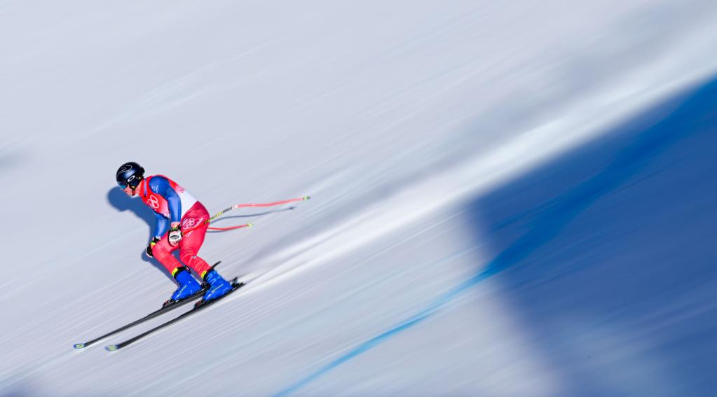 2月3日,中国选手徐铭甫在北京冬奥会高山滑雪男子滑降项目第一次训练中。新华社记者陈斌摄
