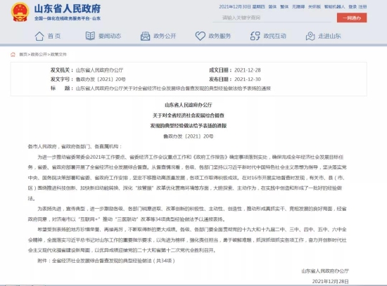 通报指出,为进一步推动省委常委会2021年工作要点、省委经济工作会议重点工作和《政府工作报告》确定事项落到实处,确保完成全年经济社会发展目标任务,省委、省政府部署开展了全省经济社会发展综合督查。在对16市开展实地督查时发现,有关市、县(市、区)围绕推进科技创新、加快新旧动能转换、深化“放管服”改革优化营商环境等方面,大胆探索、主动作为,在实践中创造和形成了一批好的经验做法。为表扬先进,宣传典型,进一步激励各级、各部门锐意进取、改革创新的积极性、主动性、创造性,推动形成真抓实干、竞相发展的良好局面,经省政府同意,对34项典型经验做法予以通报表扬。