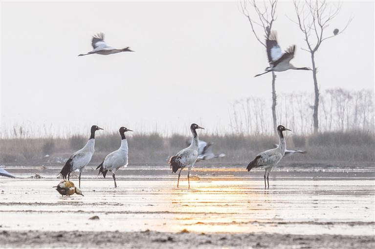 图为黑颈鹤在草海国家级自然保护区越冬。