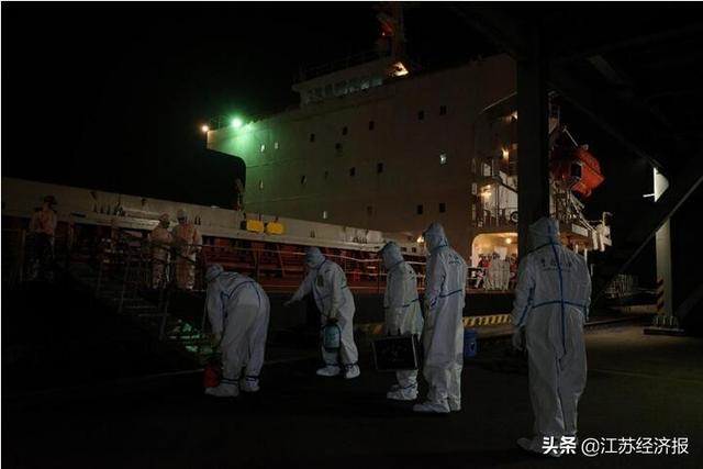 2月6日傍晚,录安洲岛只有码头亮着灯。春节假期的最后一天,随着汽笛声响,一艘外籍乙烯货船准备靠泊。沿着陡峭的舷梯,海关关员钱路和姜远穿着厚厚的防护服缓慢登轮,这是他们进入常州海关口岸疫情防控封闭专班的第10天。