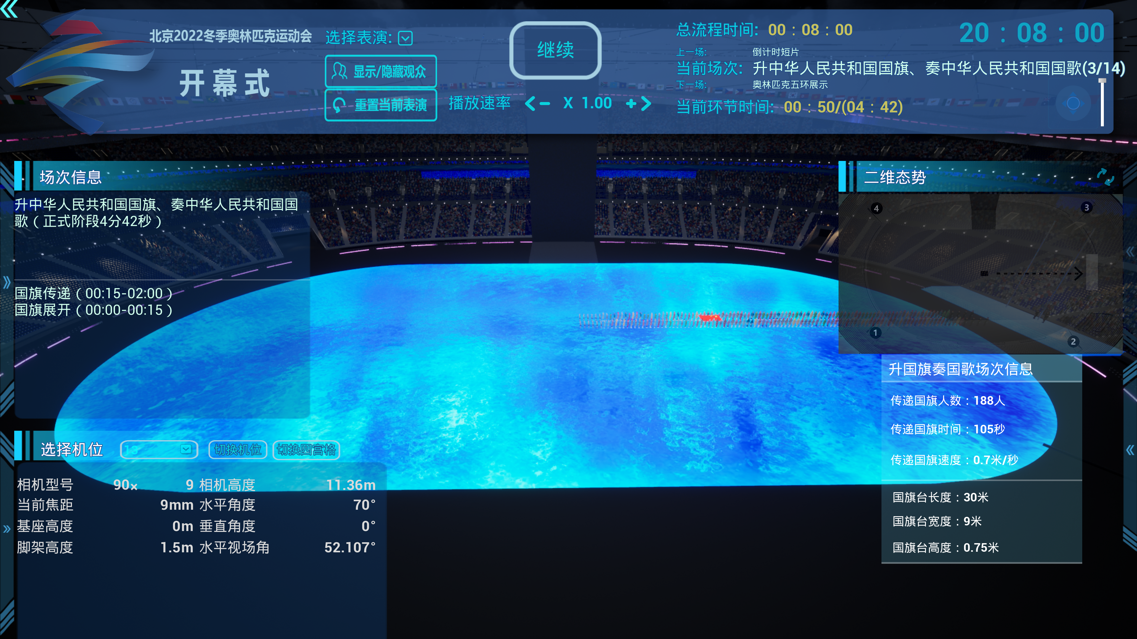 一台大型演出,涉及几十个部门或团队,大家的角度立场不同,常会因为对更好演出效果的追求产生争执。比如,一个节目结束了,下一个节目要准备上场,鸟巢出入口只有四个,这边演员要怎么退场,那边演员要怎么进场,究竟是你快一点,还是我慢一点……此时,虚拟仿真系统能对人流进行模拟,为闹矛盾的不同部门给出一个最优解决方案,并让他们在系统上就能看到调整后的效果。