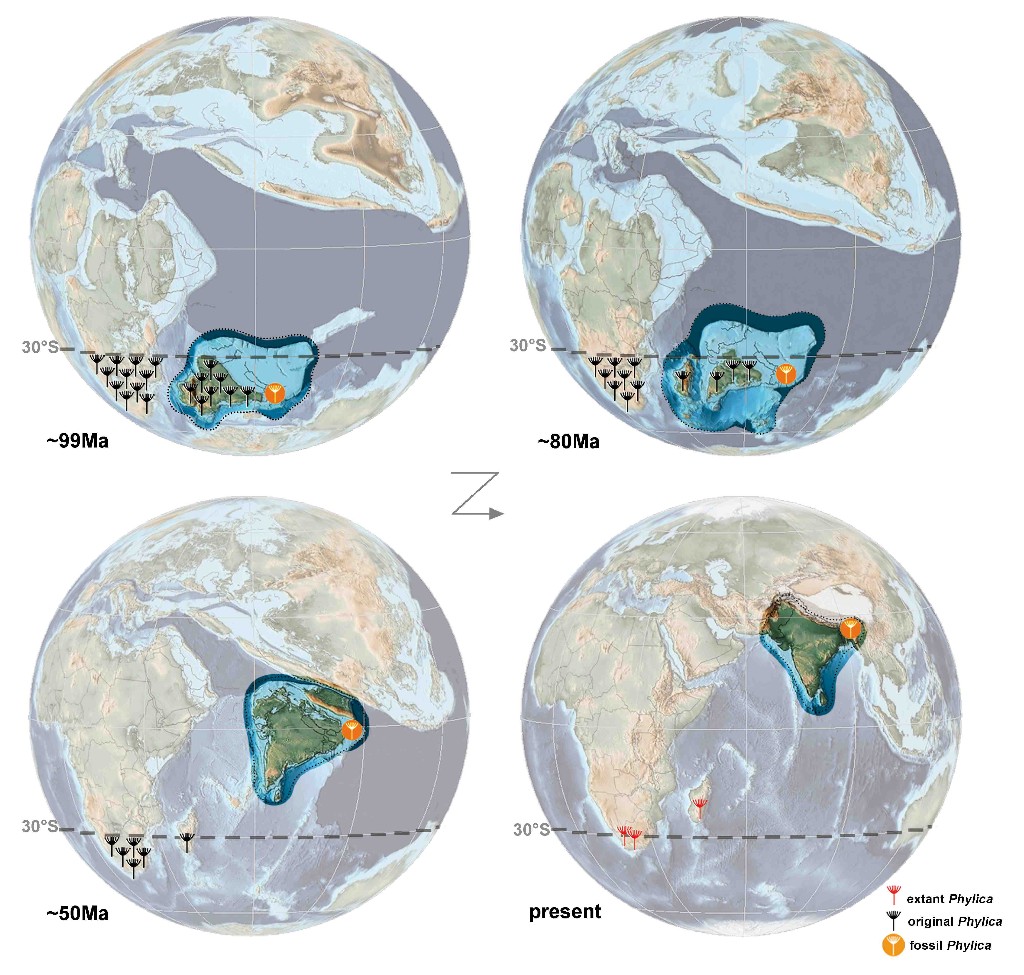 Phylica祖先随印度板块向北漂移的过程重建图。