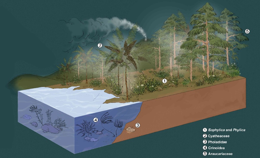 琥珀化石形成时期生态复原图,图中地表低矮植物为Phylica。